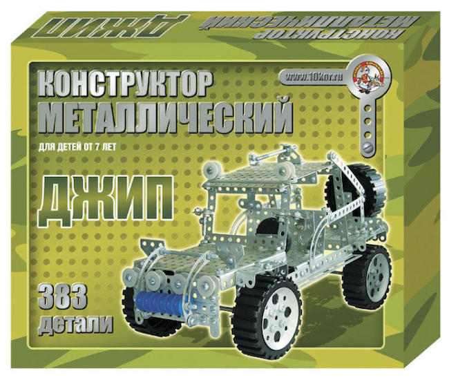 Металлический конструктор Джип можно отнести к серии средних конструкторов производимым «Десятым королевством». Он состоит из 383, а его особенностью является то, что колеса Джипа выполнены из пластмассы и имеют полностью реалистичный вид, что также его относит к серии конструкторов с подвижными деталями этого производителя.