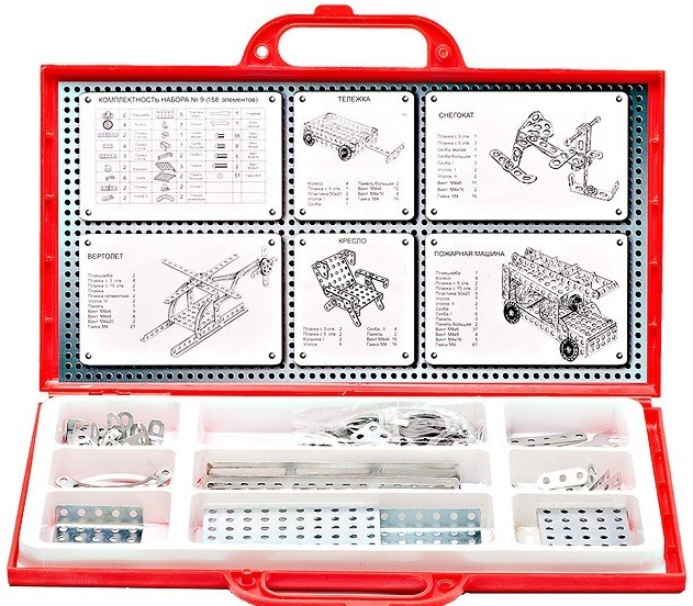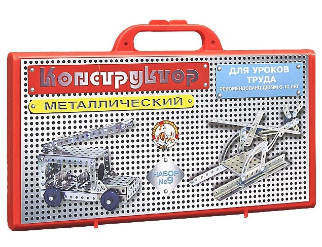 Набор номер 9 - это уникальный конструктор для уроков труда, его детали собраны в удобный кейс. Собирать металлический конструктор могут дети от 6 лет, и не обязательно этим заниматься только на уроках труда. Из набора № 9, который содержит 158 деталей можно собрать пожарную машину, вертолет, снегокат и кресло, предлагаемые инструкцией. Конечно, благодаря фантазии, собрать можно не только эти модели, но и что-то другое. Работа с металлическим конструктором приучает использовать инструменты, развивает моторику, логику и инженерное мышление, учит терпеливости и достижению намеченной цели. Присутствует здесь и соревновательный момент: можно на время собирать металлический конструктор вдвоём или даже втроём.