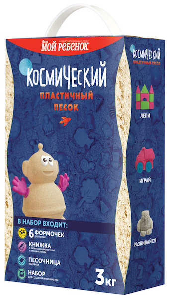 - 1 пакет с классическим космическим песком 3 кг; - 6 разных формочек; - 1 тканевая песочница; - Брошюра по лепке из песка с описанием игр и упражнений.