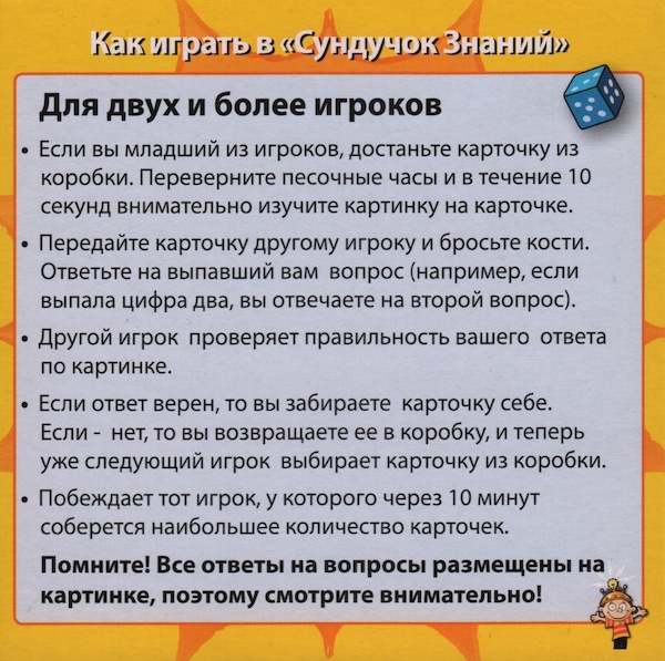 Правила настольной игры «Сундучок знаний: Мои первые картинки» очень просты. В коробке-сундучке находятся карточки с информацией и вопросами. Игроки по очереди достают одну любую карточку из коробки. Изучаем указанную на ней информацию, а потом переворачиваем ее стороной с вопросами. Далее игрок кидает кубик и отвечает на номер вопроса с карточки, который выпал на кубике. Если ответ верен — игрок оставляет карточку себе, если нет — кладет карточку обратно в коробку. Побеждает в игре тот участник, кто за 10 минут собрал больше всего карточек.