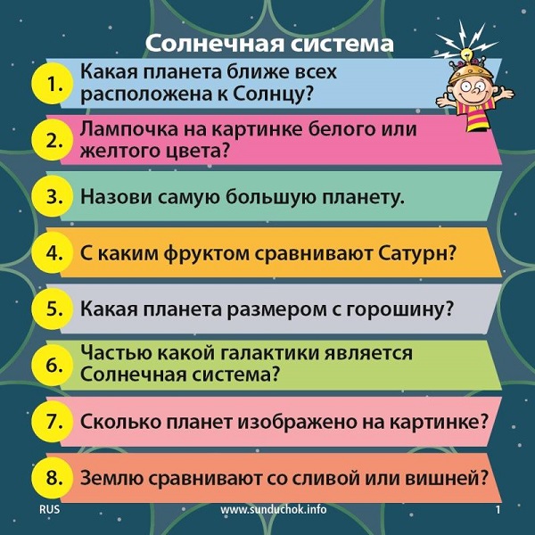 Как понятно из названия, в этой версии «Сундучка знаний» собраны вопросы, связанные с космосом. На карточках с вопросами собрана информация о солнечной системе, включая само солнце и окружающих его планетах, о безграничных просторах вселенной, инересные научные и исторические факты.