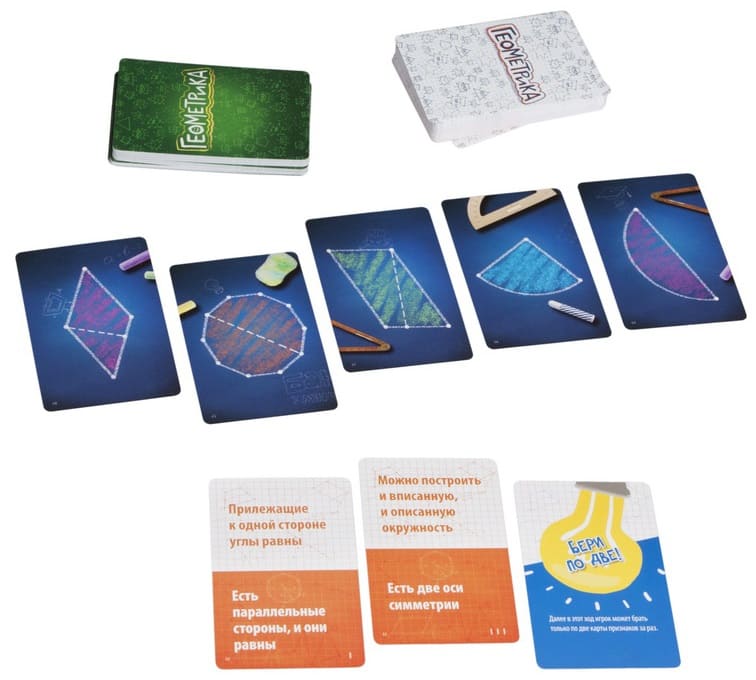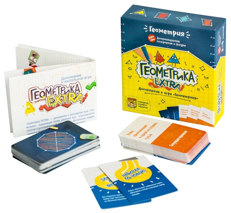 Настольная игра Геометрика Extra - это дополнение к настольной игре Геометрика. Оно привносит небольшие изменения в правила, в игре появляются новые геометрические фигуры, новые термины и понятия.