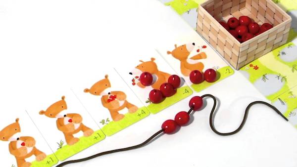 Игра начинается с раздачи карточек игрокам, их может быть от 2 до 4. В сборе начинки для большого пирога участвуют дети от 3-х лет. Но если малышу не исполнилась ещё трёх, но он знает цифры от 0 до 5, то можно смело брать его с собой. Каждому выдаётся по шнурку, куда нужно нанизывать ягодки-бусинки. Карточки открываются одна за другой. Если выпадает отрицательное значение, а медведь повёрнут вправо, придётся отдать именно столько соседу по лужайке, который располагается оп правую руку. Играйте с удовольствием, приглашайте друзей и братьев-сестричек на сбор ягодного урожая, ведь вместе веселее!