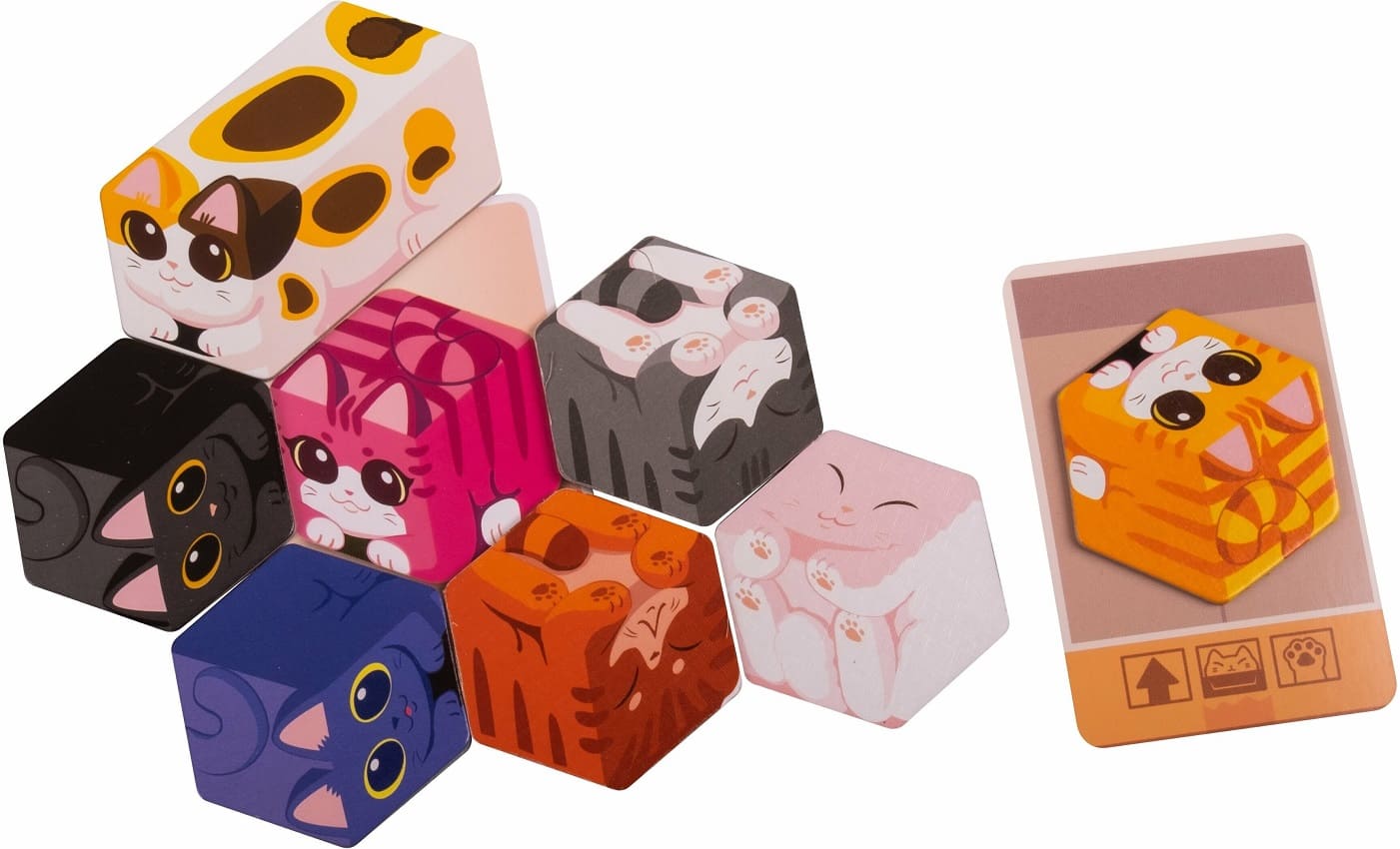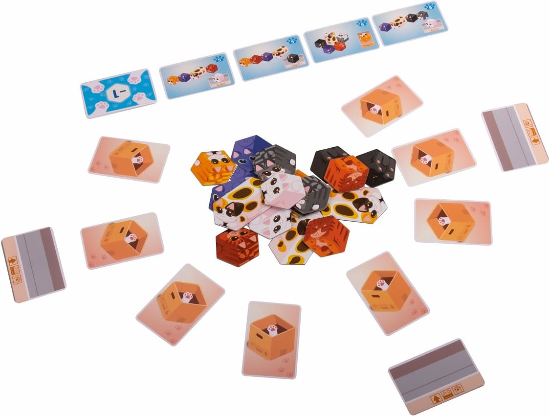 В коробке вы найдёте 7 видов кошек и котов, каждого по 4 существа. Помимо этого имеются карты коробок, как пустых, так и с пушистиками внутри. Но самое главное – это карточки котов. На них изображены полосатые в разных комбинациях. Это и есть задания, которые могут быть 1-го, 2-го или 3-го уровня. В верхнем правом углу изображено количество баллов, которые получает участник, кто первым рассадит всех по местам, как указано на картинке.
