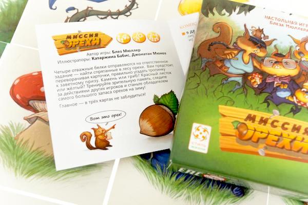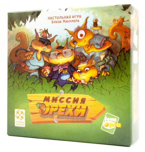 Настольная игра «Миссия Орехи» построена на прицепах игр Мемо (это там, где ищут пары карт). В ней игрокам в возрасте от 4 лет предстоит превратиться в белок, и собирать спрятанные в лесу орехи. Для того, что бы делать это успешно, необходимо правильно запоминать дорогу к ним, и иметь немного везения.