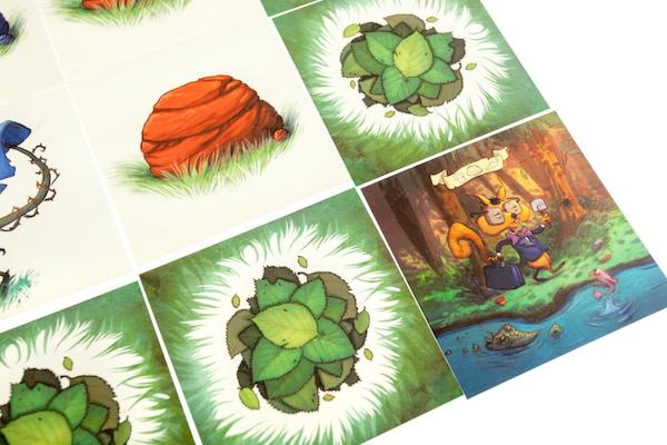 Игра «Миссия Орехи» представляет из себя набор трех типов карт: карты белок – выполняют роль фишек игроков; 9 двусторонних карт леса – на них изображены камни, грибы и растения красного, желтого и синего цвета; и карты орехов.