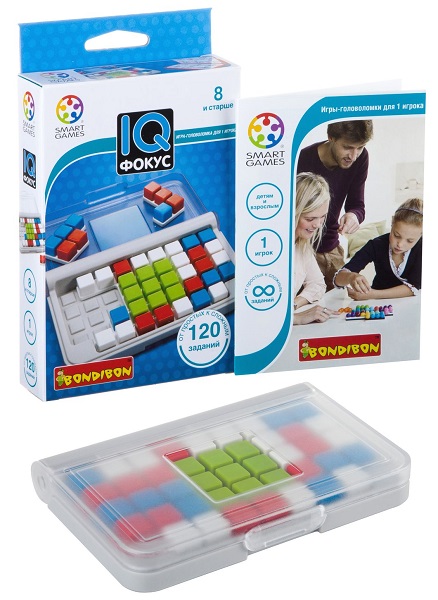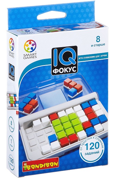 «IQ-Фокус» – это новая комбинаторная головоломка серии IQ от марки Bondibon. Принцип построен на размещении 10-ти деталей тетрисообразной формы на игровом поле, а ее особенность в том, что детали головоломки не однородно окрашены, а состоят из квадратов разных цветов. Задача игры – развить у детей пространственное мышление и логику. Как и другие головоломки этой серии «IQ-фокус» имеет компактный размер и удобную для транспортировки упаковку.
