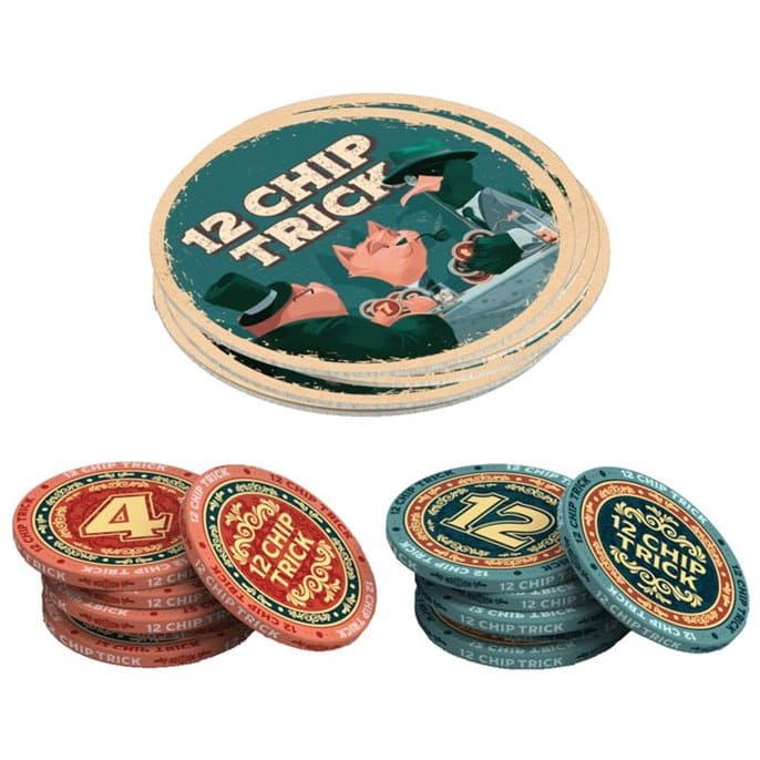 «12 фишек» - азартная настольная игра, где игроки пытаются набрать 21 очко, но вместо привычных карт, они это делают с помощью 12 фишек, половина которых красные, а половина синих — с номерами от 1 до 12. Правила игры очень просты: участники разыгрывают по 4 фишки, тот кто набрал наибольшую сумму на них - получает жетон победного очка. Но вот если сумма превысила 21, то она сгорает.