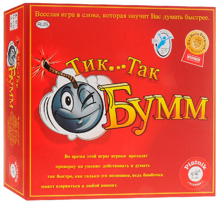 В настольной игре «Тик Так Бумм» спокойно не посидишь подбирая нужное слово, так как тебя постоянно подгоняет бомбочка-таймер, которая так и норовит взорваться в любой момент. Эта игра призвана усовершенствовать скорость мышления и натренировать память, чтобы вспомнить все слова с набором нужных букв и узнать, а также в процессе игры запомнить на будущее новые слова от других игроков. В нее могут играть и взрослые, и дети с 12 лет.