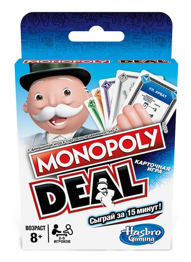 «Монополия. Сделка» - это компактная карточная версия легендарной настольной игры «Монополия». Помимо небольших габаритов, игра еще имеет не продолжительную по времени партию, и в ней Вы сможете обанкротить своих соперников в течение 15 минут.