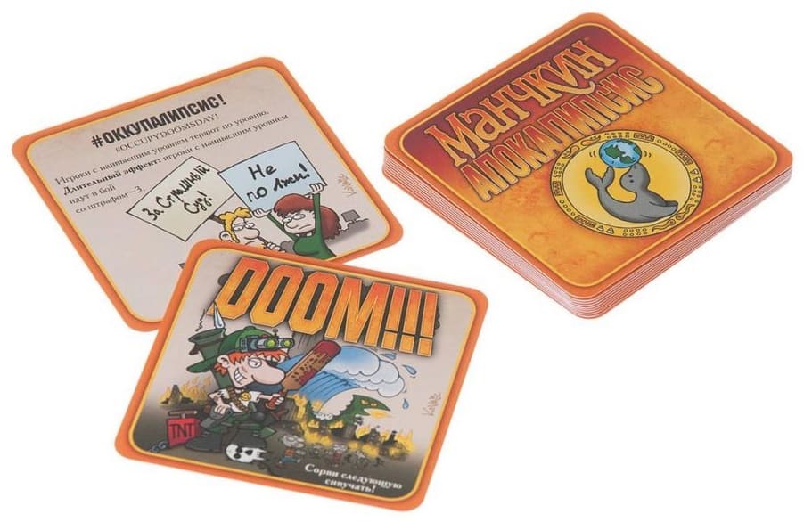 Итак, вот наступит момент, когда весь мир может рухнуть, стоит только сорваться последней седьмой печати (сивучати). А до этого вам предстоит вновь и вновь сражаться с монстрами, получая заветные сокровища и, самое главное, повышать свой уровень. Ведь апокалипсис можно пережить, если достигнуть 10 уровня. В вашем распоряжении полный набор всяких «шмоток» и невиданного оружия. Карты с навыками и умениями вам тоже, несомненно, пригодятся. Что интересно есть карты с разовыми свойствами и есть, что особенно приятно, долговременные. В любом случае, за дверью ты можешь обнаружить монстра, который окажется тебе не по зубам, тогда будешь начинать все сначала, раздарив все свои сокровища другим манчкинам. Главное, не отчаиваться и продумывать каждый свой шаг, правильно используя карты. Конечно, можешь попросить соседа помочь тебе за определенную плату. Но кто сказал, что он, получив от тебя заветный подарочек с оружием, не подошлет попозже монстра? Игра есть игра!