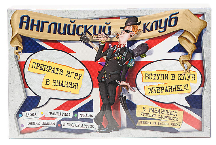 «Английский клуб» - настольная игра, призванная способствовать изучению английского языка в увлекательной форме. Игра предназначена всем кто изучает английский язык сейчас или пытается поддержать его на требуемом уровне. Создатели игры искренне надеются, что игроки быстро сумеют преодолеть языковой барьер и научаться думать на английском языке.