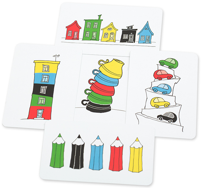Игра представляет из себя набор разноцветных колпачков (по 5 штук) в каждом комплекте и колоду карт с рисунками, на которых изображена последовательность различных предметов, раскрашенных в те же цвета что и колпачки. Задача игроков – быстрее других расположить свой набор колпачков таким образом, чтобы их цветовая последовательность соответствовала последовательности предметов на рисунке. Тот, кто первым справиться с заданием – радостно звонит в победный колокольчик.