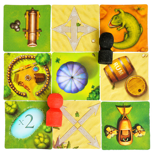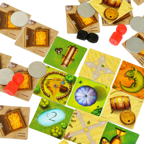 В распоряжении каждой команды, которых может быть максимум 4, по 3 матроса и по 1 кораблю. Не так много? Но всё может быть еще печальнее, если один из ваших пиратов случайно наткнётся на бутылку рома и пропустит по этой причине ход... Суть игры ясна любому морскому волку - разжиться на монеты, и как можно больше этого добра перетаскать к себе на корабль! А сложность состоит в том, что на пути к сокровищам будут попадаться горы, пустыни, болота. Но есть и клетки-помощники с ледниками, самолётами и воздушными шарами. Действие каждого матроса зависит от особенностей вновь открытой клетки. За 1 ход можно либо переместить своего матроса, либо передвинуть корабль вдоль берега. Кстати, пираты могут плавать, а не только передвигаться по суши. Цель каждой команды - перетащить на корабль больше золотых монет. Но они такие тяжёлые, что каждый раз можно нести лишь 1!