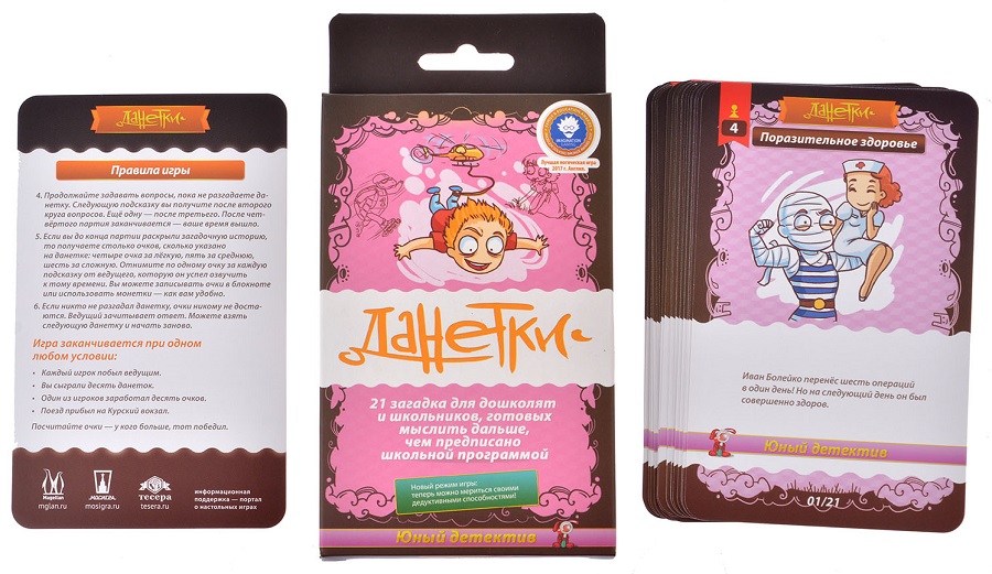 Устали от расспросов детей, надоело отвечать на одни и те же вопросы по несколько раз? Вас выручит настольная игра «Данетки Юный детектив», которая надолго займёт пытливый ум юного исследователя, а взрослым даст возможность отдохнуть. Поэтому она станет беспроигрышным вариантом для родителей первоклашки. Учит самостоятельности, помогает принимать серьёзные решения и выстраивать алгоритмы, развивает образное мышление.