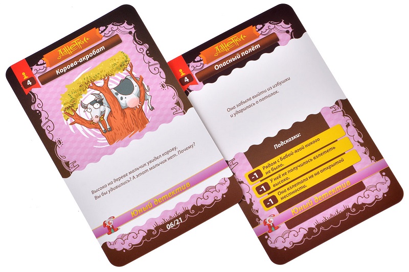 Важно задавать вопросы, которые действительно помогут расследованию. За них начисляются баллы. Неправильная версия лишает очков, верная приносит новые. Игра прекращается, когда пора спать, мама зовёт на прогулку или Самый Логичный набирает конкретное количество очков, предположим, 20 или 30.