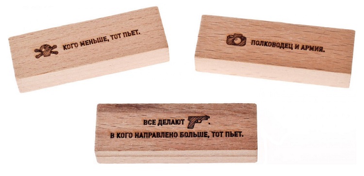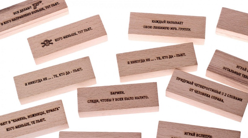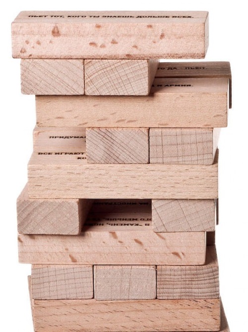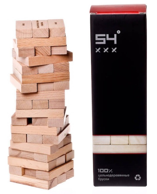 А так, все как обычно. Соберите башню, укладывая по 3 бревнышке в ряд, а каждый последующий ряд перпендикулярно к предыдущему. Игроки по очереди вытаскивают бревнышки с нижней части башни и кладут наверх. При этом на большинстве бревнышек есть задания-фанты, которые нужно выполнять. Короче алкогольная башня «54 градуса» - это такой настольный мини-тамада, и конкурсы проведет, и выпить предложит.