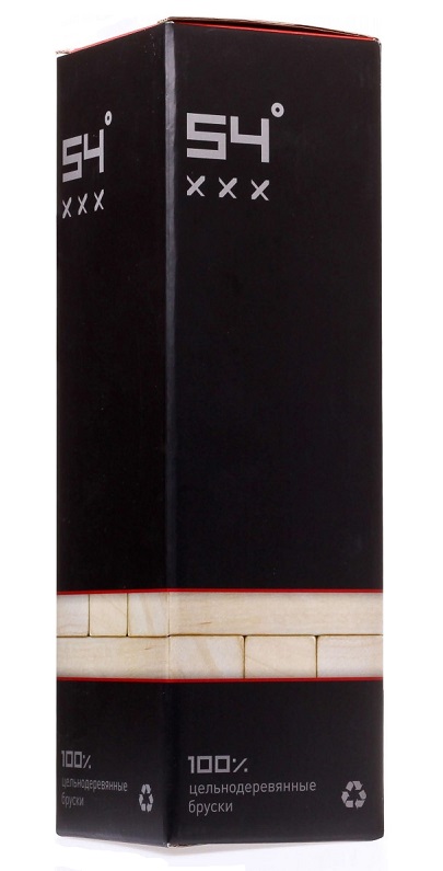 Каких только разновидностей настольной игры «Башня» (она же «Дженга») не существует на свете – и простая, и с фантами, и в три бруска шириной, и в четыре, с цифрами и цветная… Короче все шло к тому, чтобы появилась алкогольная башня. И, опаньки, вот она - под названием «54 градуса». Спросите причем здесь градусы? И почему 54? Тут все просто. 54 – это количество брусочков, используемых в игре. Ну а градус – это такая единица измерения, которой можно мерить почти все, от углов и температуры - до научных степеней (degree в английском варианте). Ну, и как ни странно, в нашем случае к доле спирта в водном растворе градусы в названии отношения не имеют.