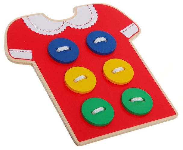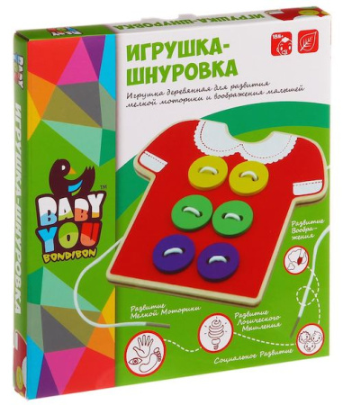 Продукция под маркой Bondibon уже давно завоевала доверие у родителей, благодаря продуманности игровой механике, качественному исполнению и развивающим особенностям игр. Игра-Шнуровка от Bondibon предназначена для детей в возрасте от 18 месяцев. Она выполнена из дерева в виде яркой маечки с пуговицами. Игроку предстоит продевать шнурок через все дырочки таким образом, чтобы «пришить» все пуговки. Все материалы из которых изготовлена игрушка экологичны и имеют большой размер, а значит безопасны для маленьких детей.