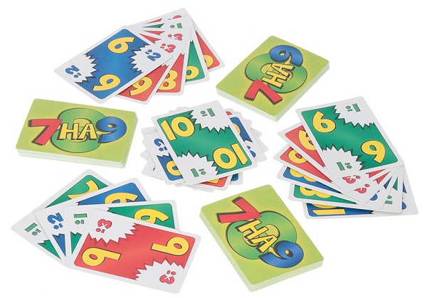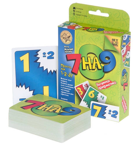 Цель настольной игры «7 на 9» - первым избавится от своих карт на руках, выкладывая их в игровую стопку. На каждой карте изображены большая желтая цифра от 1 до 10, отображающая ее номинал, и маленькие цифры в углах со знаками «+/-», показывающие сколько нужно прибавить или отнять от данного номинала, чтобы получить значение новой карты, которая может быть положена сверху. Например: на карте изображена большая 3 и маленькая 2, то следующей картой, которая может быть выложена на нее может быть 5 = (3+2) или 1 = (3-2). Важно, все результаты вычисления должны иметь значения от 1 до 10, поэтому если получаемый результат больше 10, то от него нужно отнять 10 (например, 9+3=12, вычитаем 10 и получаем 2 – значение следующей карты). Если же результат меньше 1, то нужно прибавить к нему 10 (пример: 2-3=-1, прибавляем 10, получаем 9, следующая карта должна быть номиналом 9).
