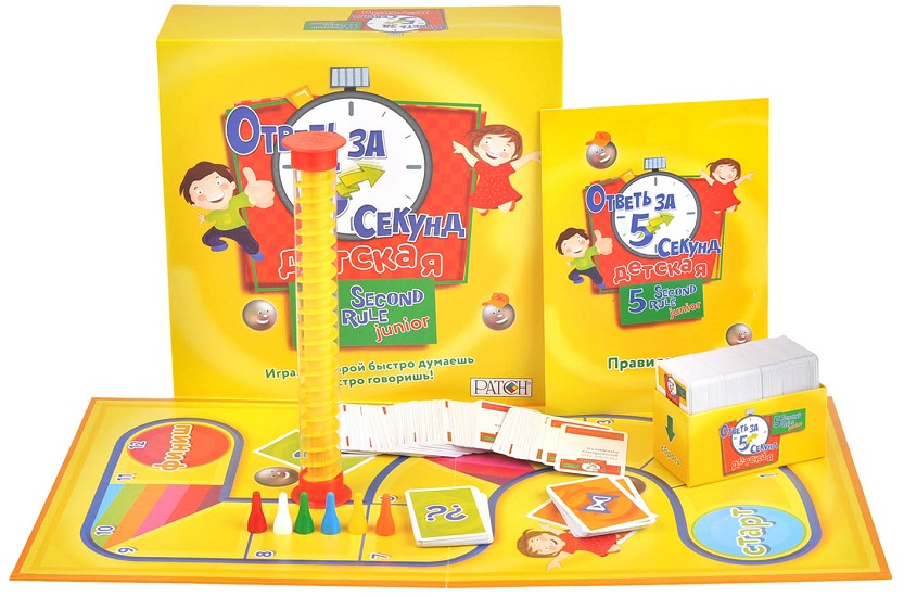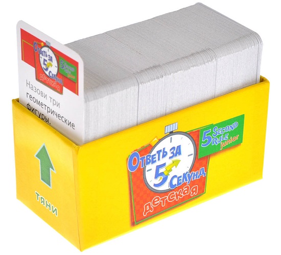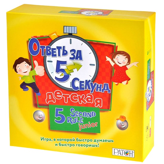 «Ответь за 5 секунд Детская» - русифицированная и адаптированная под шестилетний возраст игроков версия мирового бестселлера «5 Second Rule». Эта игра - компанейская викторина, для победы в которой потребуется не только широкая эрудиция, но и смекалка и быстрый ум. Все вопросы в викторине начинаются со слов «Назови два…», для шестилетних игроков, или «Назови три…», для старших, а дальше может быть что угодно: два (три) животных на букву К, озера, города и т.п. и т.д. Досуг с игрой «Ответь за 5 секунд Детская» пройдет не только весело, но и позволит расширить кругозор играющих.