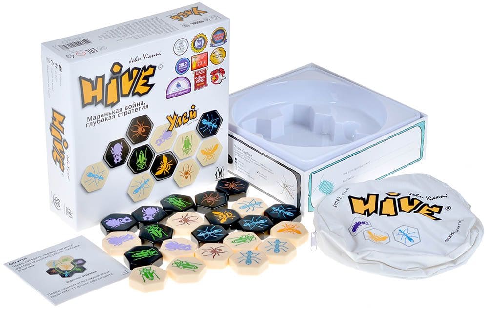 Настольная игра Улей (Have) – это абстрактная стратегическая игра для 2 игроков в возрасте от 8 лет. Большинство абстрактных настольных игр имеют простые правила, но сложность правил игры Улей, мы бы оценили как среднюю. Дело в том, что каждый отдельный обитатель Улея, имеет свои правила хода (наподобие фигур в шахматах), что несомненно усложняет игру. Дело в том, что изобретатель игры Джон Янни изначально задался идеей создать игру на подобие шахмат, но без игровой доски. Стоит отметить, что эта идея ему удалась. Игра Have увидев свет в 2001 году собрала не мало престижных наград из мира настолок, а права на выпуск игры были проданы более десятку издательств. Эта игра подойдет любителям неспешных стратегий, разовьет стратегическое мышление и логику.