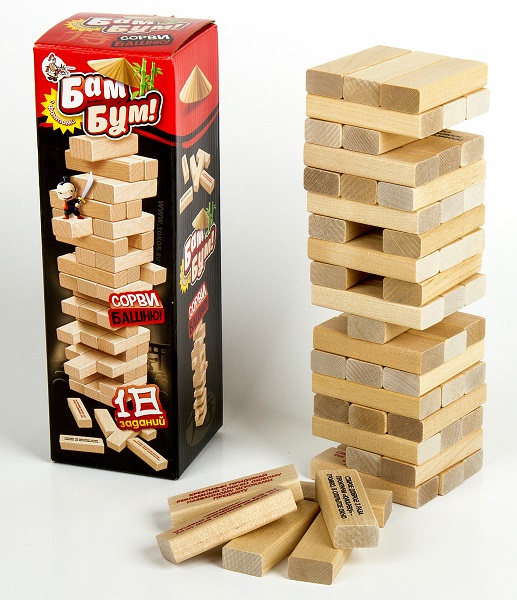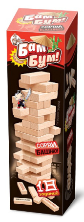 Настольная игра Падающая башня с фантами Бам-Бум - это достойное продолжение серии игр от отечественного издательства Десятое королевство, ставшим отличной альтернативой подорожавшей в кризис американской Дженге. Ее основное отличие - нанесенные на 18 брусочках веселые задания - фанты. Надписи на бруски нанесены красками, при этом надпись никак не сказывается на степени скольжения брусочков. Игрокам предоставлен выбор - играть в обычную Падающую башню, или с фантами Бам-Бум. Как и в классической Падающей башне, в башне с фантами Бам-Бум 54 брусочка, которые укладываются в 18 рядов (по 3 брусочка в каждом).
