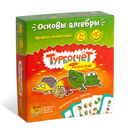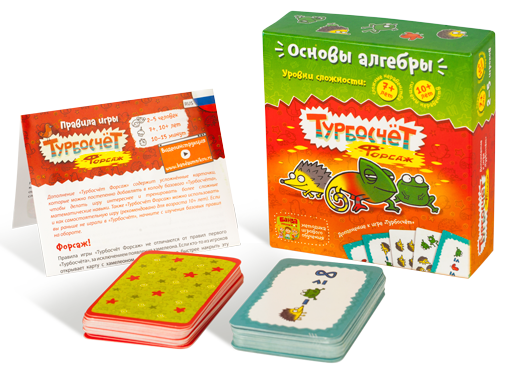 Настольная игра «Турбосчет Форсаж» - это более сложное продолжение популярной игры «Турбосчет», в которой игрокам предстоит соревноваться в навыках быстрого устного счета. «Турбосчет Форсаж» может быть использована как самостоятельная игра, а также как усложняющее дополнение к первому выпуску игры. Все карты Форсажа разбиты на три уровня сложности, и их можно в любой пропорции смешивать с картами «Турбосчета». Игра рассчитана на математиков в возрасте от 10 лет, но запросто будет по силам и более юным продвинутым игрокам.