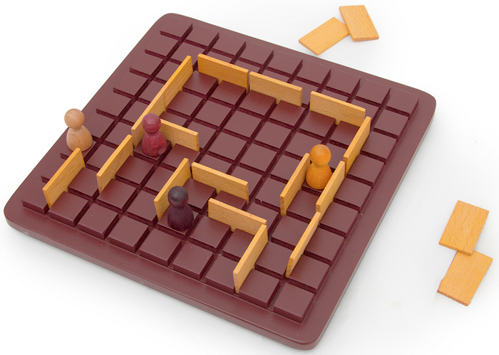 Интересная логическая игра, основанная на противодействии игроков. «Ах, ты поставил мне стену, тогда я тоже перегорожу тебе дорогу к финишу!». В нее можно играть, как вдвоем, так и вчетвером. При последнем варианте события на «поле боя» развиваются непредсказуемо: возникают и исчезают коалиции, сплачиваются еще недавние соперники в борьбе против тех, кто близок к победе. Несмотря на достаточно простые правила, которые быстро усваиваются даже детьми, игра притягивает глубиной процесса и большим количеством вариантов ходов.