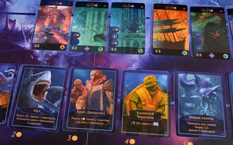 Главным залогом успеха в игре «Акватика» являются комбинации карт на руке игрока. Подобрав удачный вариант, в свой ход игрок может совершить до десяти действий. Так что процесс пополнения своей колоды карт новыми океанскими существами один из самых важных. Именно с их помощью можно исследовать глубины и поднимать из них найденные ресурсы в свое королевство.