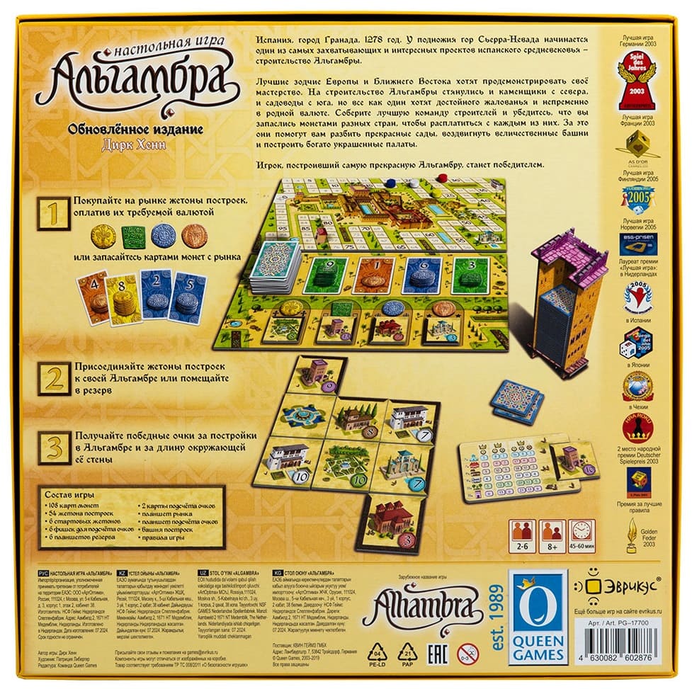 Вам предстоит копить карты монет 4 разных типов, чтобы затем покупать жетоны построек на рынке и размещать их в своей Альгамбре, следуя правилам строительства. В течение игры происходит 3 этапа подсчёта очков - очки распределяются в зависимости от количества построек разных видов. Игрок, набравший больше всего очков, победит!