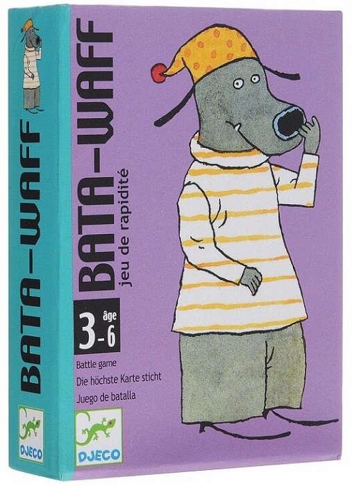 Настольная игра «Батаваф (Bata-waf)» от Djeco – это настоящая карточная битва для малышей от 3 лет. В ней тот игрок сильней – на чьей карте изображена самая большая собака. Для удобства игроков, которые еще не очень хорошо считают и не знакомы с цифрами, каждая карта снабжена ростовой линейкой с закраской, и малыши могут легко сравнить карты.