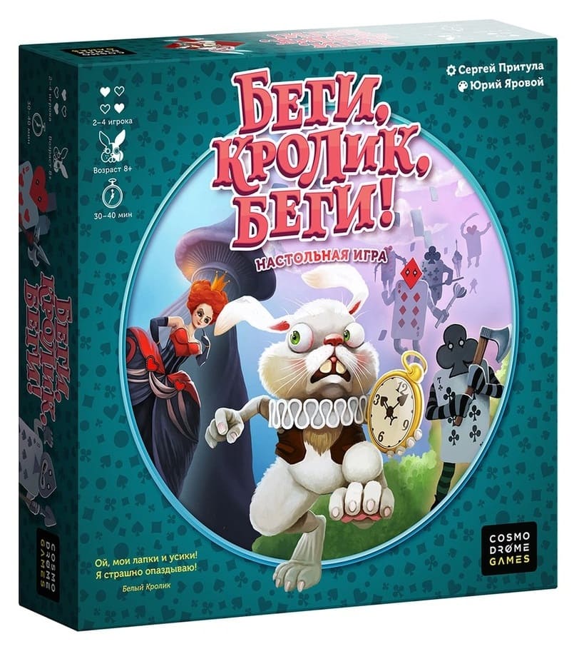 «Беги, кролик, беги!» - необычная настольная игра-ходилка, созданная по мотивам сказки Льюиса Кэрролла «Алиса в стране Чудес». В ней игрокам предстоит провести кроликов по полю, чтобы они попали на Большое Чаепитие. Но победителем станет не самый быстрый кролик, а тот игрок, чьих пирожков окажется больше всего у этого кролика.
