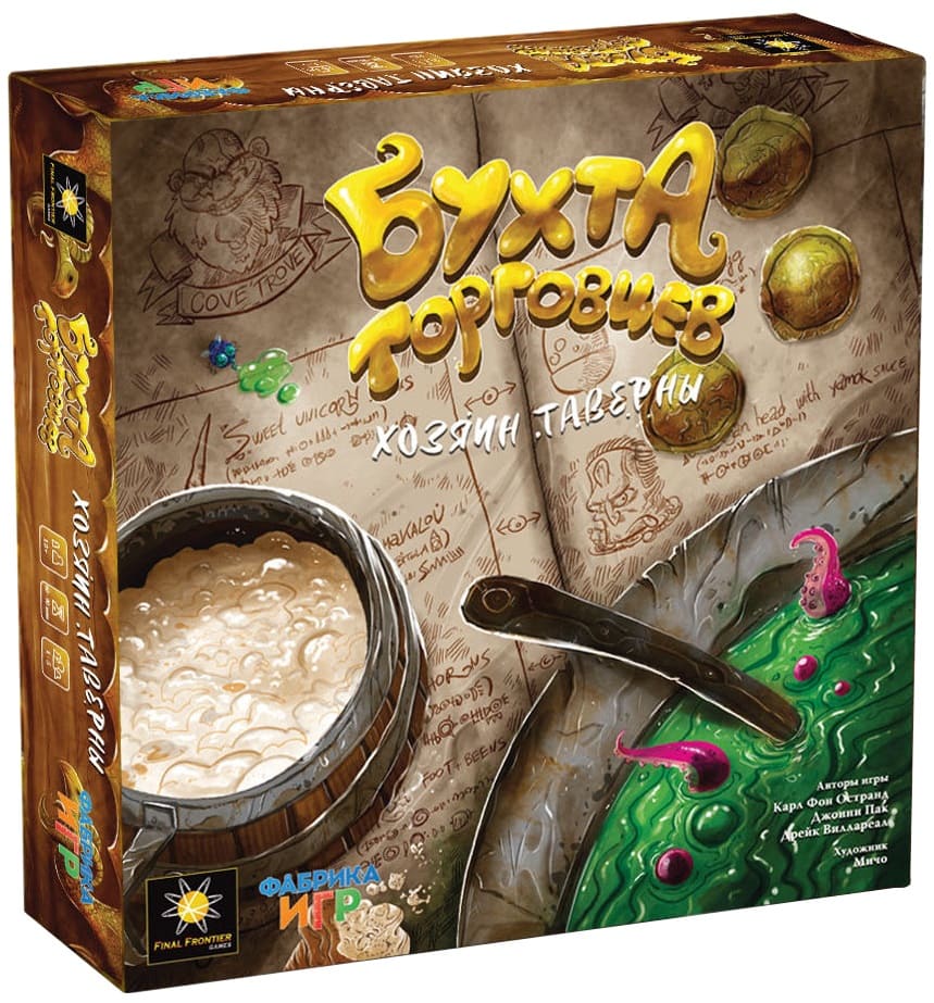 «Хозяин таверны» - дополнение к настольной игре «Бухта торговцев», которое, как несложно догадаться по названию, вводит в игру нового торговца – трактирщика мистера Скверна. Он предлагает своим клиентам простые, но очень востребованные вещи: алкоголь, постель и крепкий пинок под зад устраивающим неприятности посетителям. Уставшие искатели приключений очень любят заглянуть в таверну мистера Скверна после закрытия рынков.