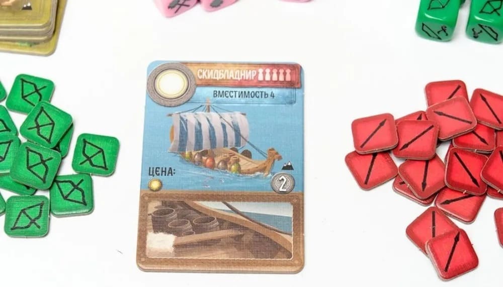 - Дополнение "Тёмные горы": Поле "Тёмных гор"; 2 планшета вождей; 5 карт рун; Расширяющий планшет палаток; 24 карты Ётунов; 24 карты сухопутных походов; 4 жетона палатки; 24 карты врагов; 5 фигурок рабочих; 12 кубиков лучников; Карта судьбы; 6 жетонов "100 очков"; 2 маркера очков; Военный корабль вождя; Правила игры.