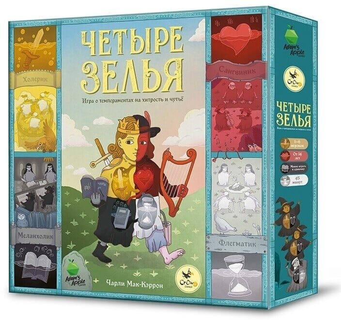 «Четыре зелья» - настольная игра, сюжет которой построен на гуморальной теории, а ключевая механика опирается на «дилемму заключенного» - проблему теории игр, которая гласит, что игроки не всегда идут на сотрудничество друг с другом, даже несмотря на обоюдную выгоду. В общем, в игре вас ждут сложные психологические расчёты, блеф, обсуждения и социальная дедукция.