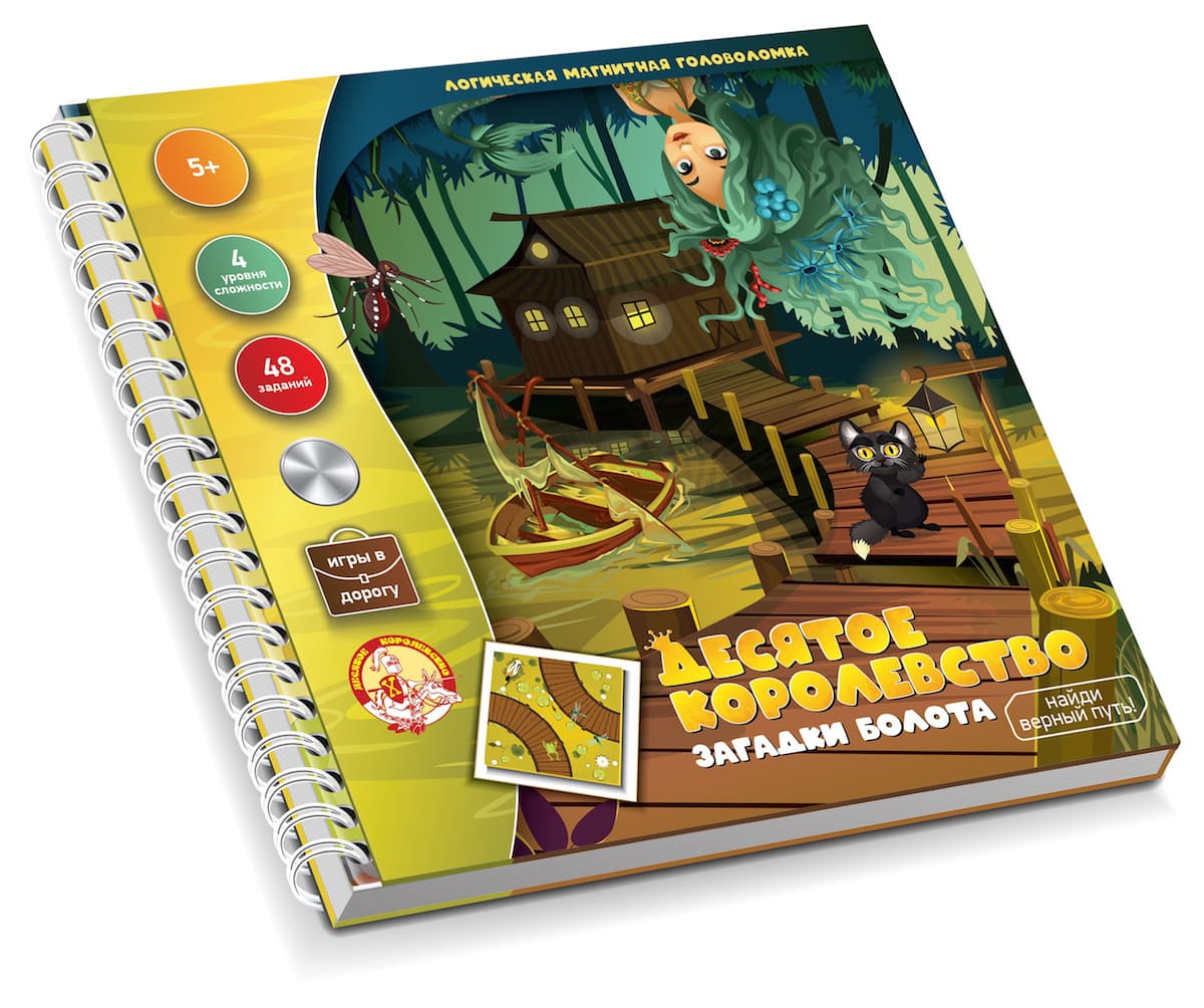 В головоломке «Загадка болота» игроку требуется построить на игровом поле дорожки из 9 магнитных элементов таким образом, чтобы они соединяли обитателей королевства, отмеченных в заданиях красной стрелкой.