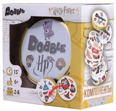 «Доббль. Гарри Поттер (Dobble. Harry Potter)» - это самая популярная настольная игра на внимательность и скорость реакции, выполненная по известной лицензии, фанатами которой являются миллионы людей. В ней традиционные картинки «Доббля» заменены на изображения персонажей и артефактов из волшебного Хогвартса.