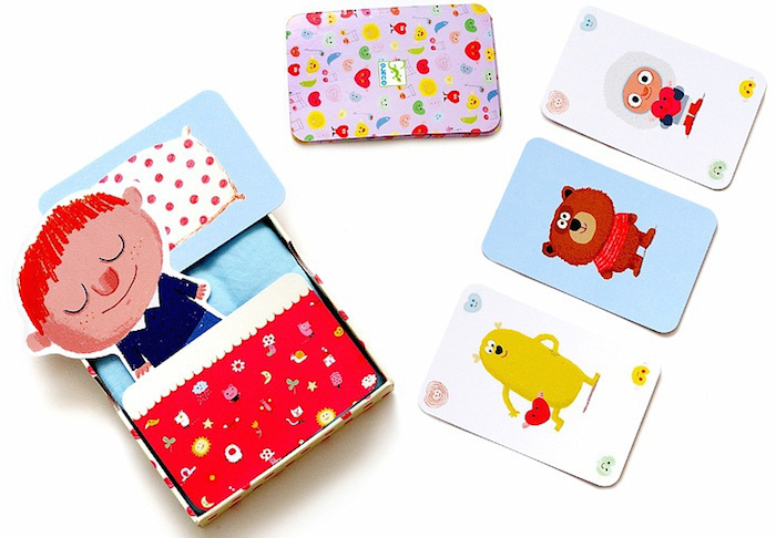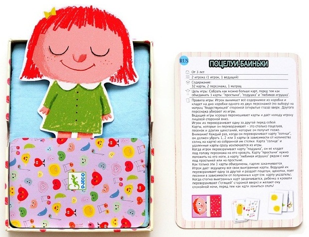 Игрок кладет карту персонажа на матрац и открывает по одной карте из колоды ведущего, пока не соберет комплект из карт "простыня", "подушка" и "любимая игрушка". За собранные карты игрок получает от ведущего поцелуи, щекотки и колыбельные песенки. Эта игра очень поможет малышам и родителям в процессе подготавливания ко сну.