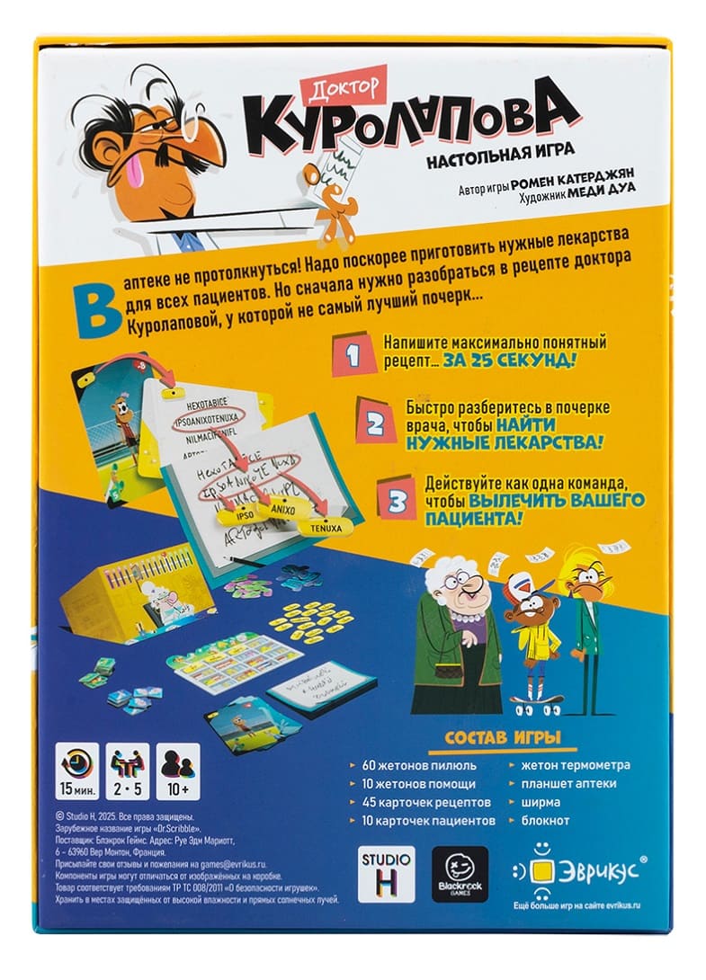 «Доктор Куролапова» — кооперативная настольная игра для небольшой дружеской вечеринки, в которой участникам предстоит на себя примерить роли доктора и провизоров, пытающихся разобрать каракули на его рецепте. Цель - совместными усилиями вылечить пациента за 3 раунда. В каждом раунде один из игроков становится доктором и за 25 секунд старается переписать рецепт с 4 названиями лекарств. Остальные берут на себя роль аптекарей и за 2 минуты должны разобрать написанное в рецепте и составить названия лекарств на планшете аптеки, используя специальные жетоны пилюль.