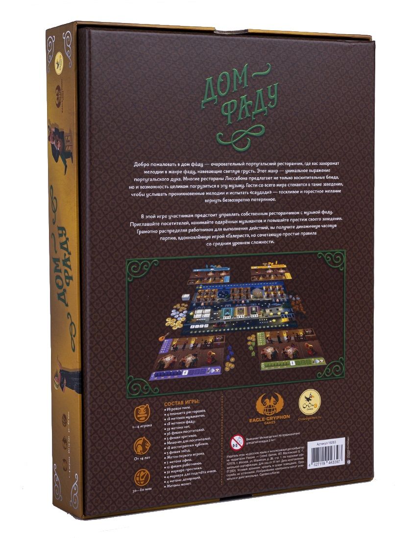 «Дом фаду» – стратегическая настольная игра в которой участники берут на себя роль рестораторов, в заведении которых выступают исполнители фаду — португальского романса. По ходу игры им предстоит принимать немало непростых решений о грамотном управлении: заключать контракты с музыкантами, привлекать посетителей, заслуживать одобрение критиков, подбирать репертуар заведения, продвигать своих протеже и наблюдать за рождением новых звёзд.