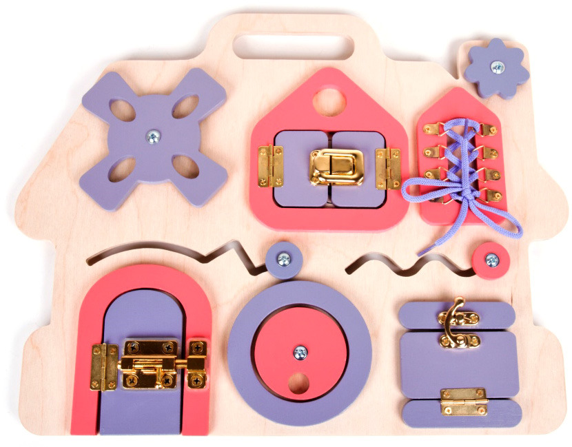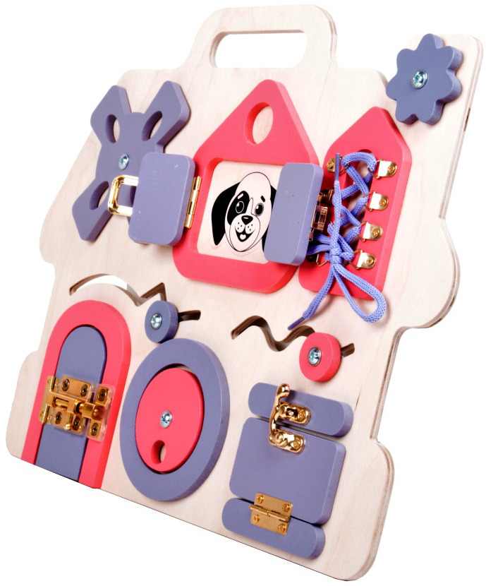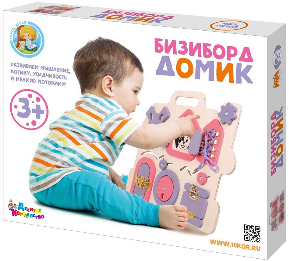 Основная задача бизиборда "Домик" от "Десятого королевства" - познакомить ребенка с основными принципами функционирования большинства домашних бытовых приборов, при этом без причинения возможного вреда самим используемых дома приборов, ни, что самое главное, самому ребенку. Разрабатывая моторику пальцев малыш готовится к настоящей жизни.
