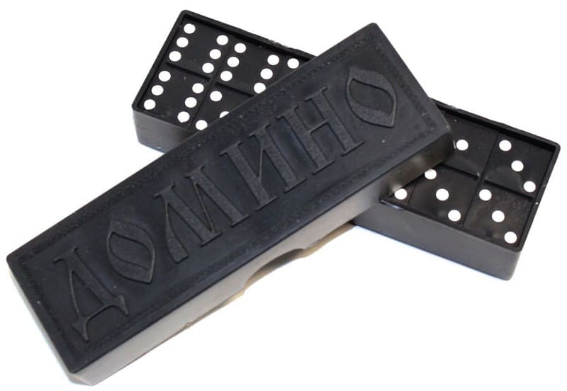 Это самое бюджетное домино со значениями от 0 до 6 точек. Его кости сделаны из черной пластмассы, точки окрашены в белый цвет.