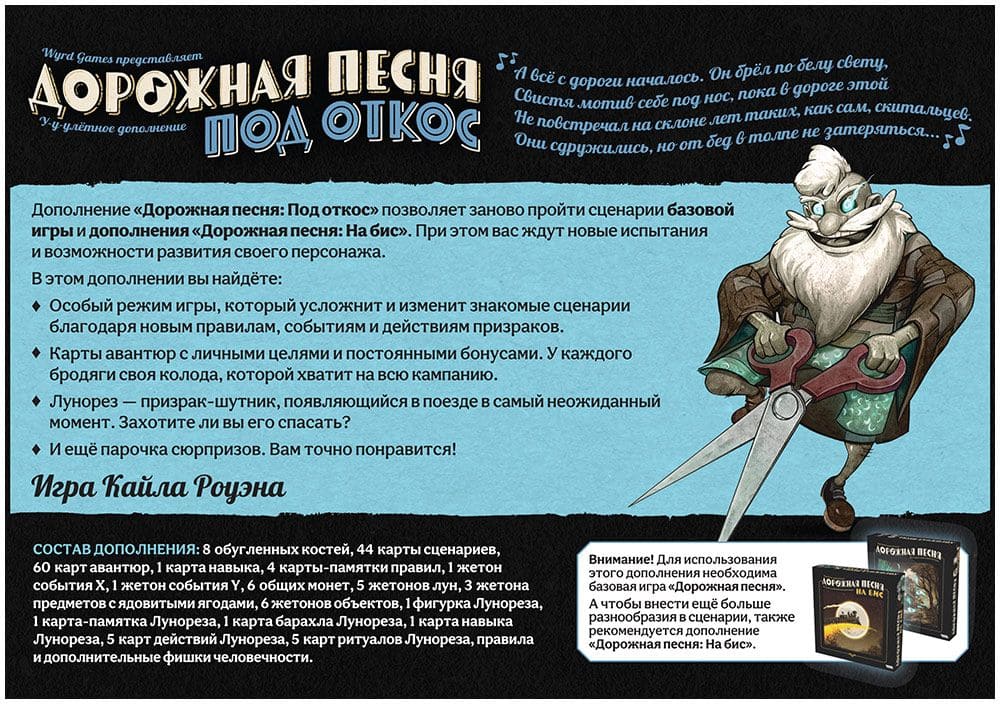 Дополнение "Дорожная песня: Под откос" позволяет заново пройти сценарии базовой игры и дополнения «Дорожная песня: На бис». При этом вас ждут новые испытания и возможности развития своего персонажа.