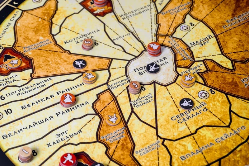 - Управление ресурсами. Пряность служит валютой для покупки карт, высадки войск и восстановления павших героев. • Аукцион. Игроки торгуются за карты уловок, не зная точно, что именно они покупают.