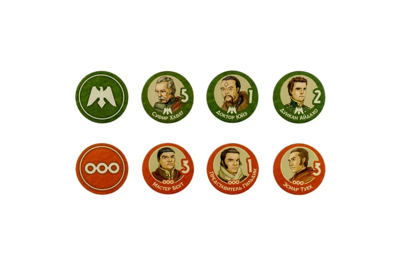 - Компоненты для усложненного уровня: Жетон песчаного червя, Карта и жетон «Квисатц Хадерах», Жетон учёта потерь;
