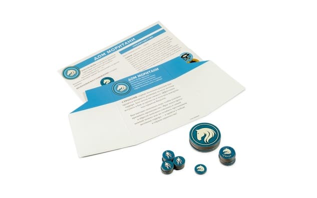 - Комплект компонентов Дома Мортиани: Ширма фракции, Лист с описанием фракции, Маркер фракции, 5 больших жетонов лидеров, 20 малых жетонов отрядов, Карта союза, 6 жетонов террора, Жетон атомной пустоши;