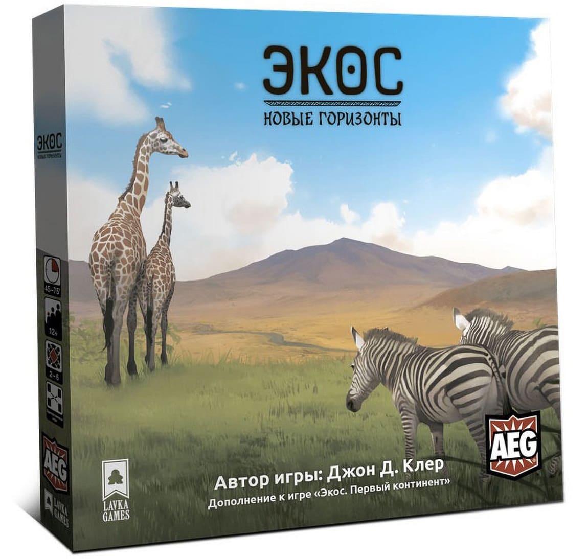«Экос. Новые горизонты» — дополнение к настольной игре «Экос. Первый континент», которое добавляет в игру новую механику розыгрыша карт особых участков местности. Каждый такой элемент по своему взаимодействует с ландшафтом континента и оказывает влияние на действия игроков. Теперь на континентах игроков появятся такие объекты как гора Килиманджаро, пустыня Сахара, парк Серенгети и другие. Новые же животные, от зебр до нильских крокодилов, позволят разнообразить и увеличить популяции вашей экосистемы.