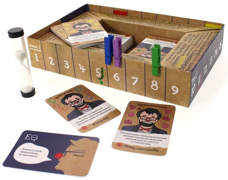 Что только не предлагают в качестве задачи различные настольные игры на ассоциации: угадать слова или фразу, определить действие, найти правильную картинку и многое другое, но только игра «Эмоциональный интеллект» предлагает разгадать … эмоции игроков. Кажется невероятным, но человек испытывает множество эмоций, а игра содержит 135 карт с ними. Автором игры является профессиональный клоун, и его сценический образ изображен на всех картах с эмоциями.