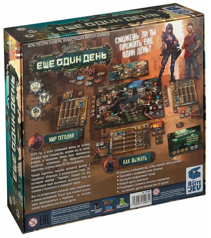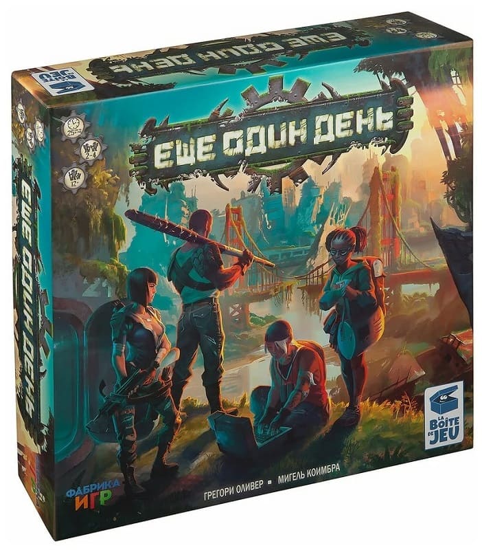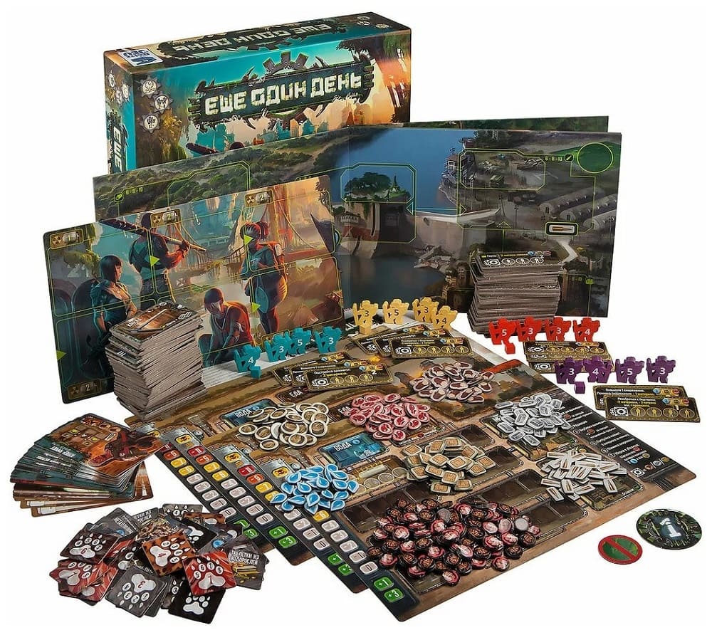 «Еще один день» - настольная игра на выживание в постапокалиптическом мире с оригинальной механикой размещения рабочих для компании от 2 до 4 человек старше 12 лет. Разработка проекта шла 3 года и финансировалась через сбор средств на Kickstarter, полученный результат удовлетворил не только авторов, но и удостоен множеством положительных отзывов от обозревателей и продвинутых игроков.